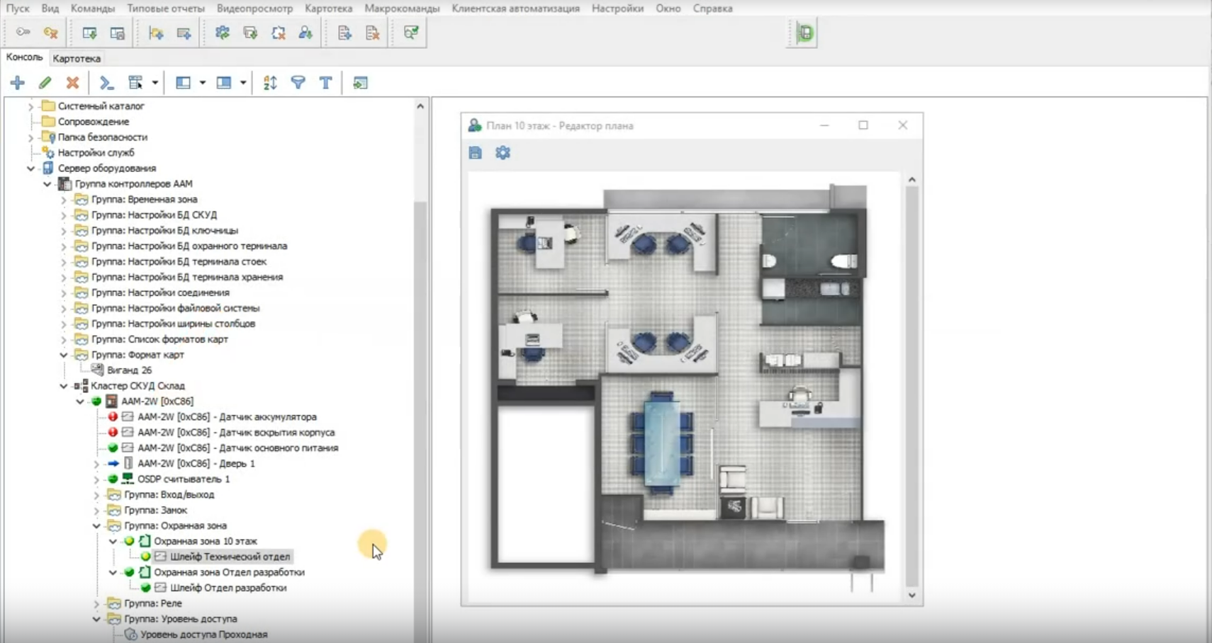 В программных комплексах APACS и LyriX предусмотрена возможность создания графических планов помещений для визуализации расположения оборудования и охраняемых зон.