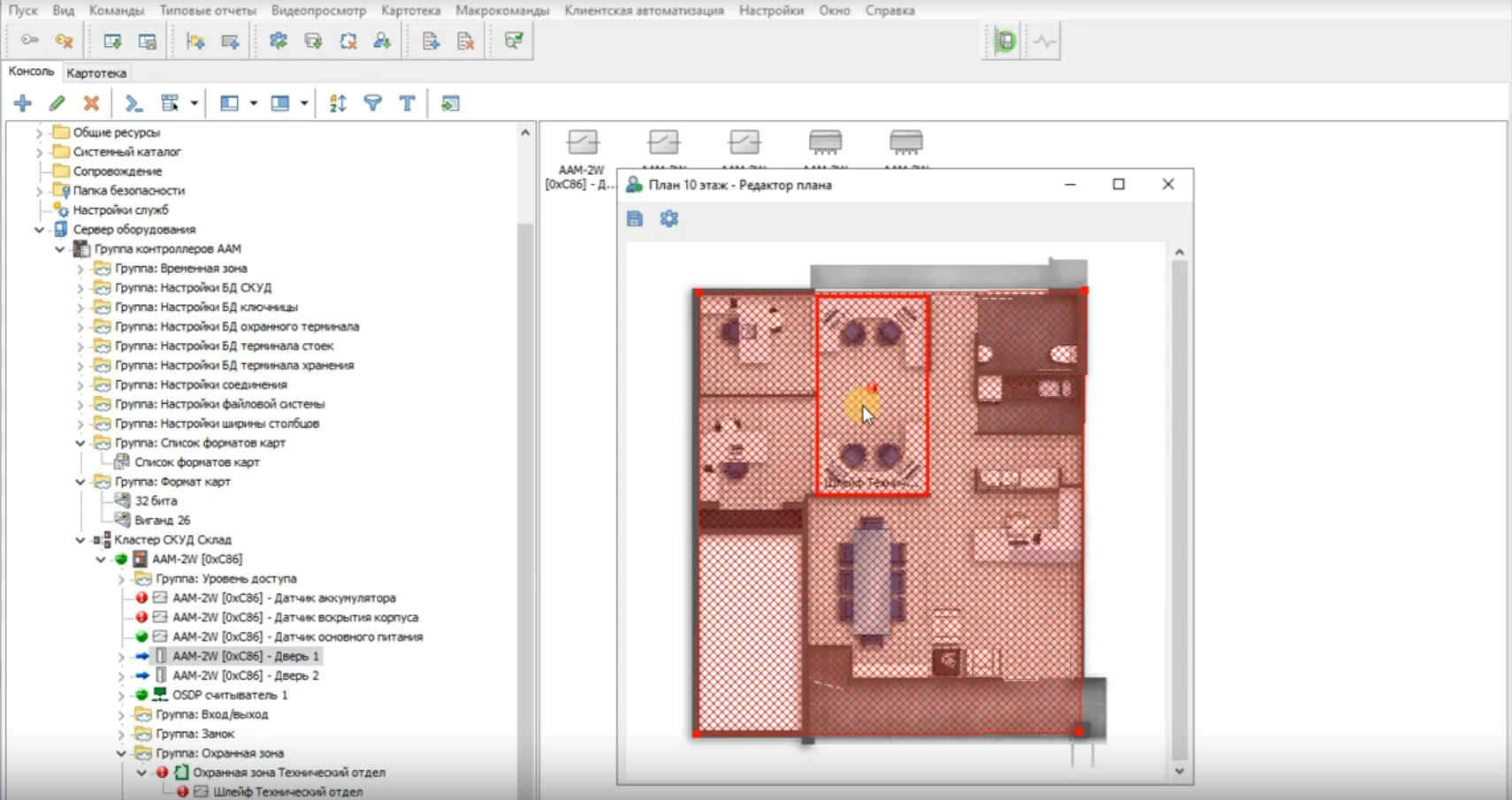 • На план переносятся объекты из дерева системы: охранные шлейфы, двери, охраняемые зоны и другие компоненты.