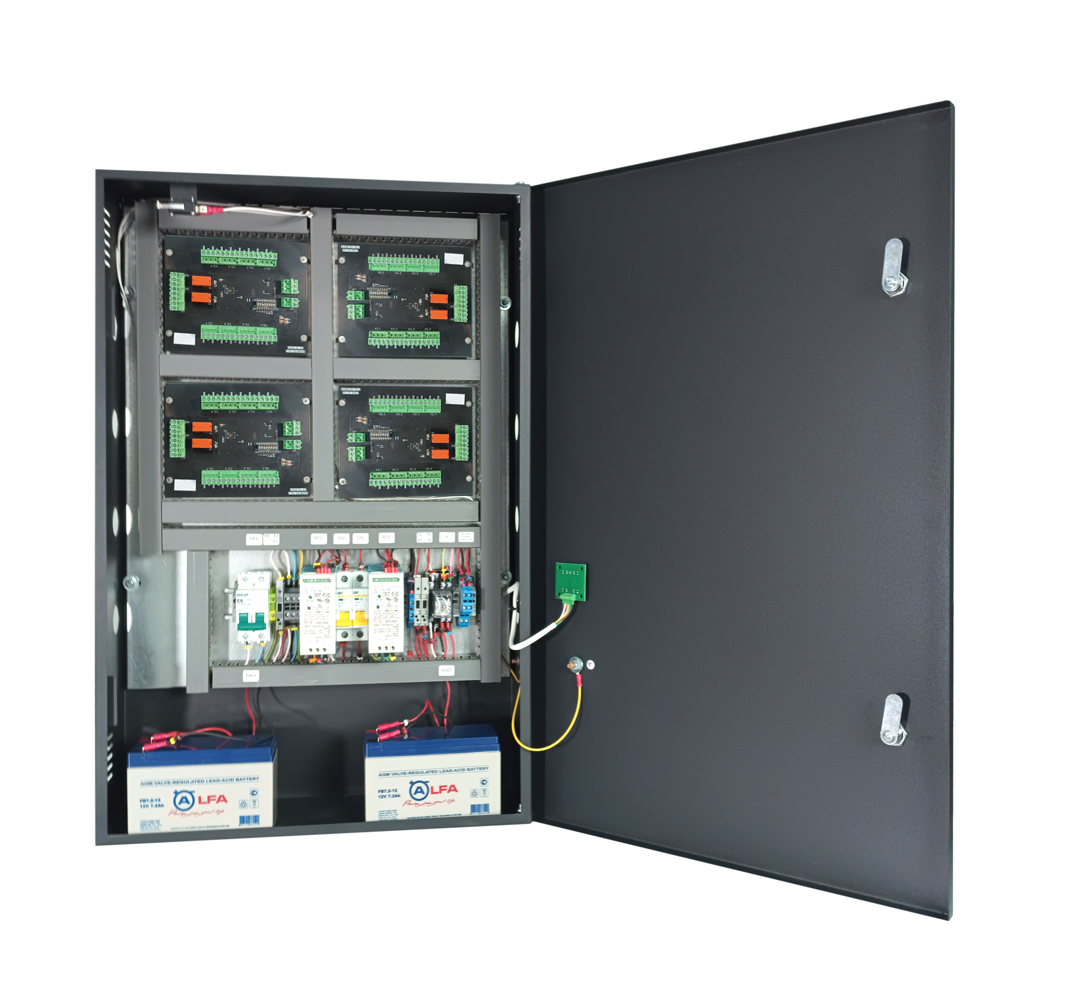 Специализированный шкаф для четырёх охранных панелей AAM-IO-16/2, с установленными внутри двумя источниками питания, с замком и датчиком вскрытия корпуса (ключи в комплекте).