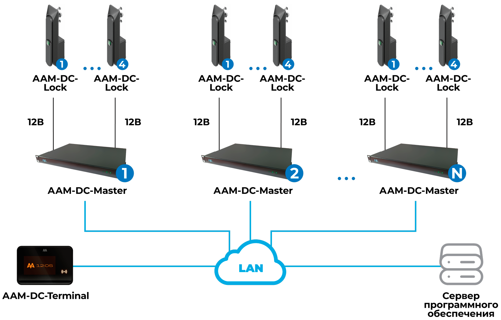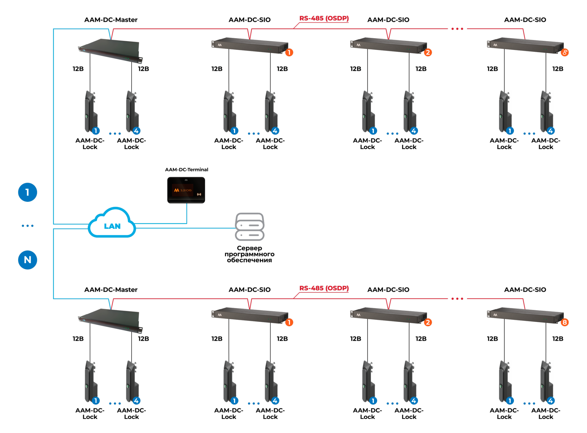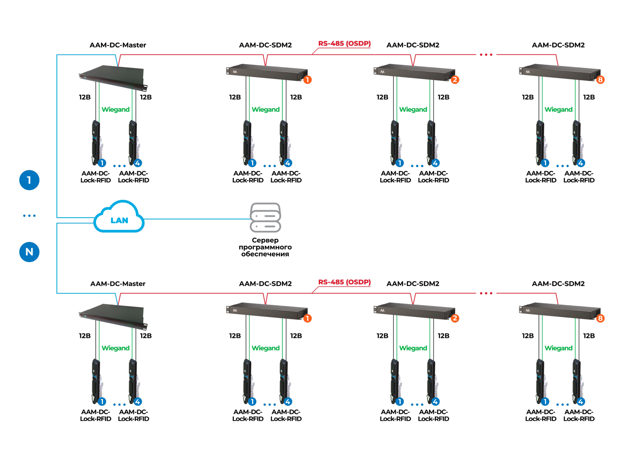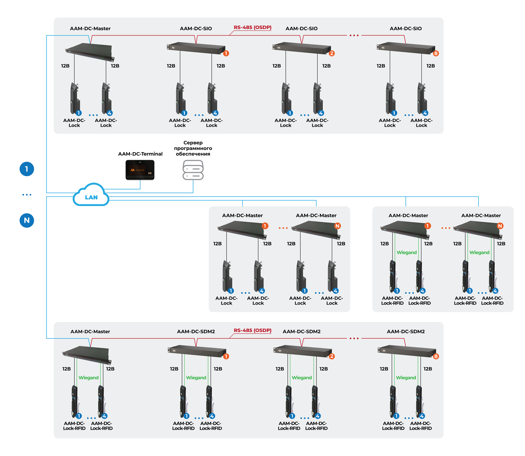 В рамках одной системы может быть множество контроллеров AAM-DC-Master, объединенных в кластер с мгновенным обменом информацией. К каждому контроллеру, в зависимости от модификации, может быть подключено от 2 до 4 замков.